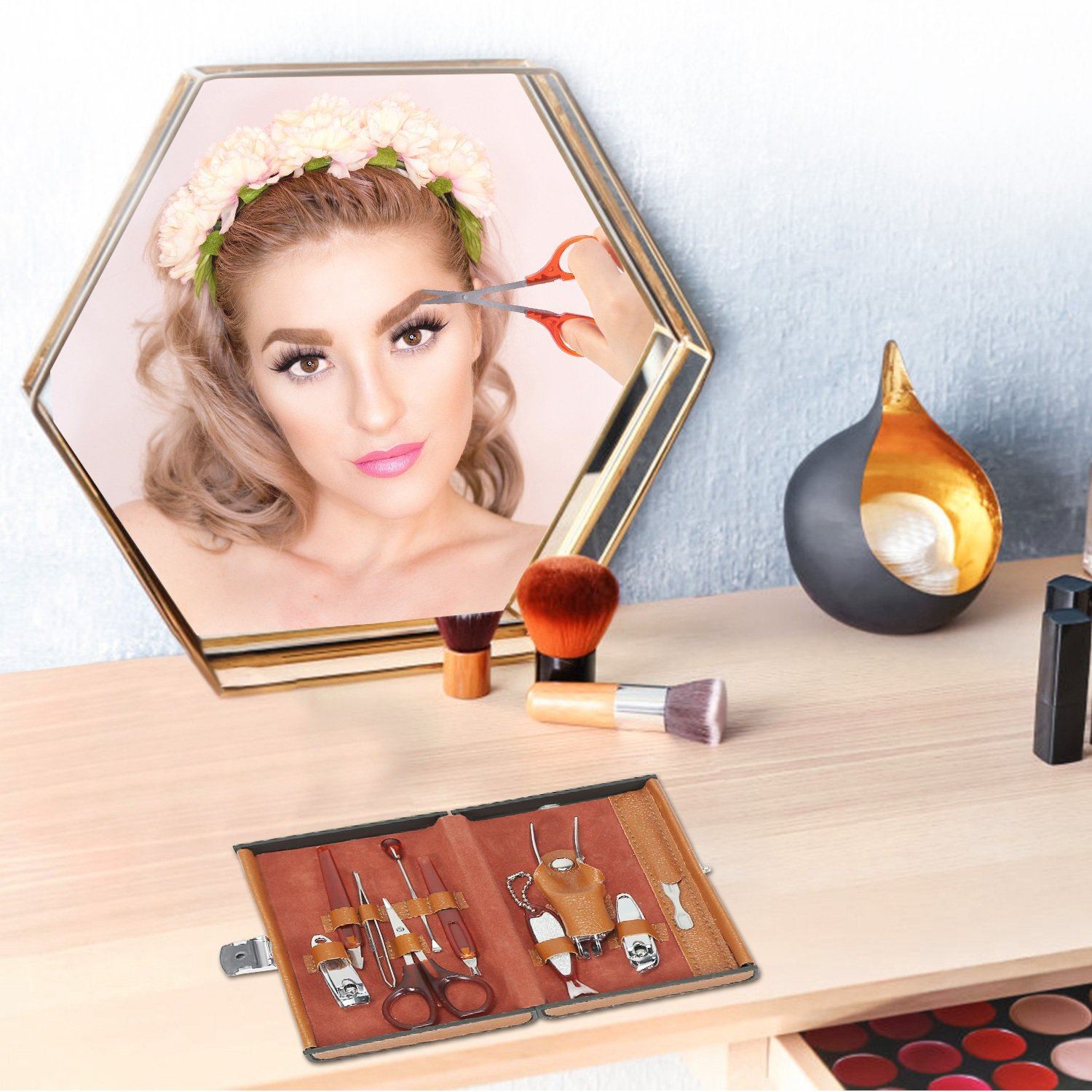 Our 10 pcs nail trim set are made from medical-grade stainless steel solid carbon steel, which includes fingernail and toenail clippers & nail file, meets all you need of manicures or pedicures, easy to keep clean and hygienic. It comes with a portable durable PU leather case for easy carrying when traveling. There is an organized compartment inside the case for each of the 10 tools so that they are held in securely and can be used conveniently. It is perfect size for your purse when you are traveling.