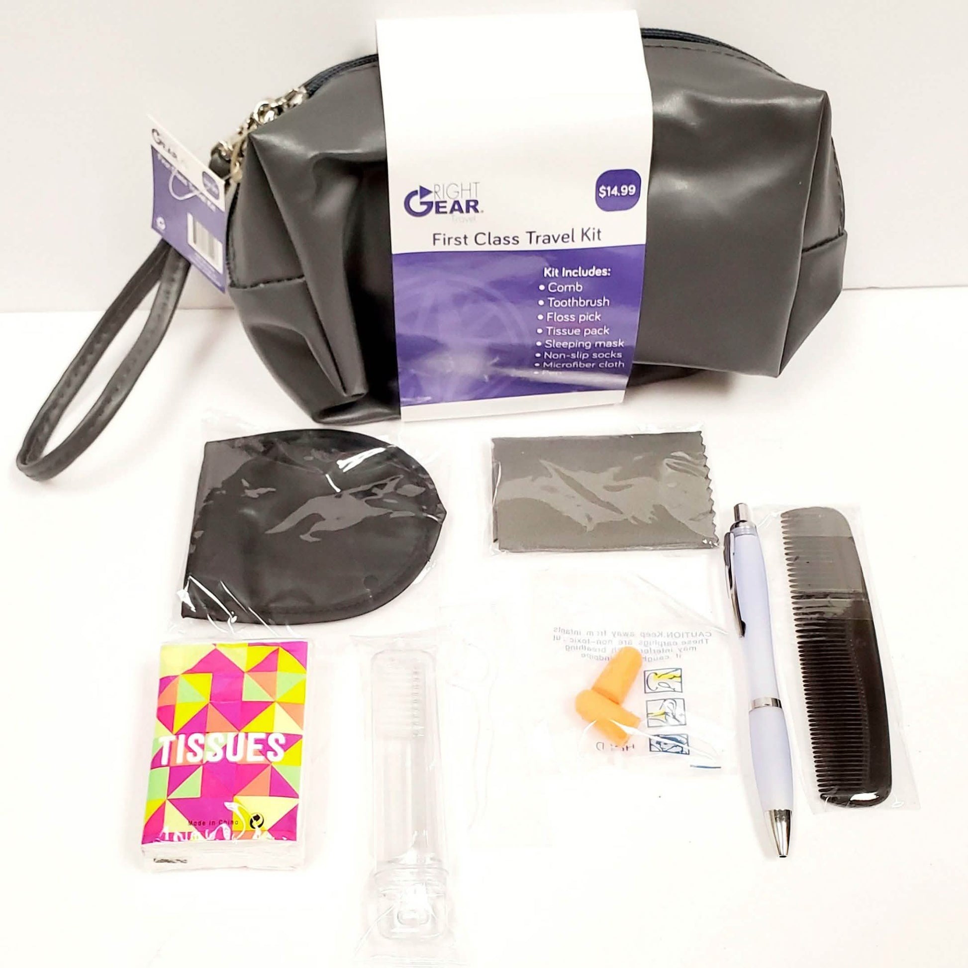 - Kit includes: vinyl zippered toiletry bag, comb, toothbrush, floss picks, tissue pack, sleeping mask, ear plugs, microfiber cloth, pen.