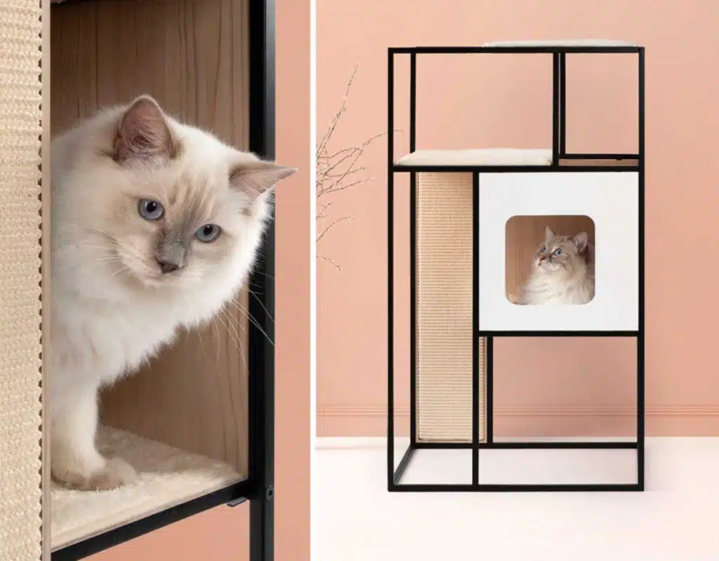 The Catit Vesper PATIO stands out as a comfortable cat tree that effortlessly looks fresh and contemporary in your interior. Vesper PATIO cat furniture gets its Italian aesthetic from the sturdy metal frame, which elegantly encases the vertical cat scratcher and frames the den with beautiful wood laminate panels.