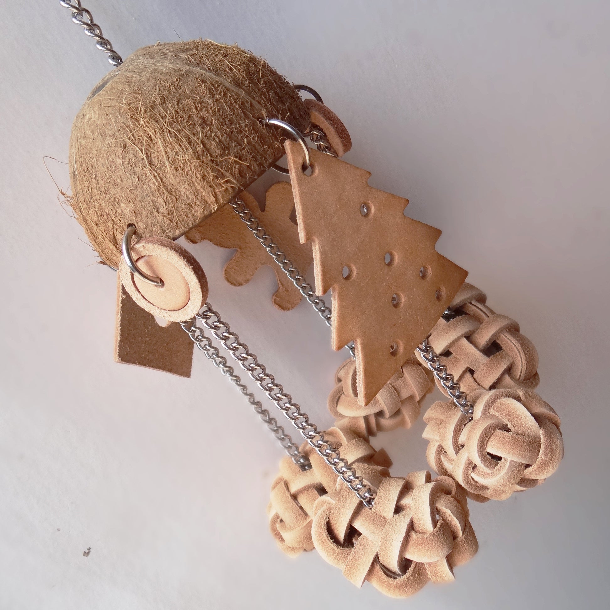 Pablo’s BomBom Coconut is fun leather bird toy.