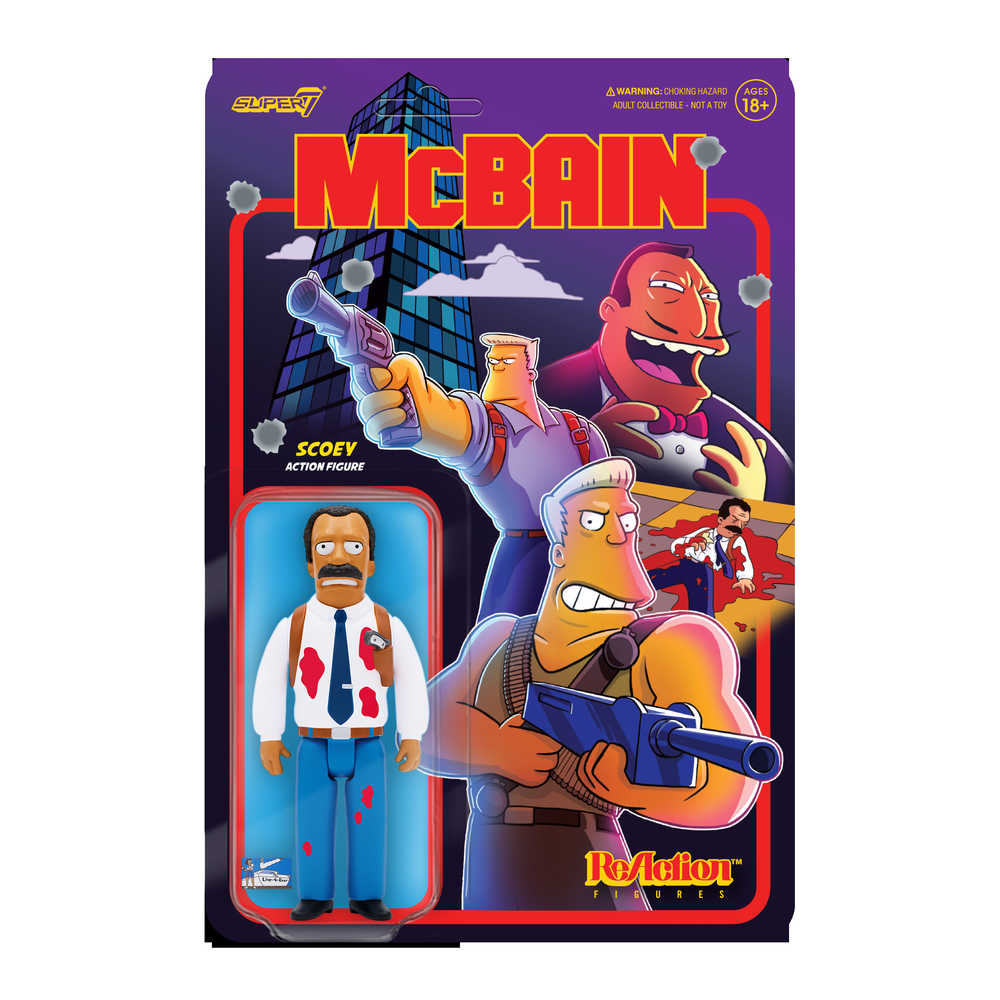 As seen in The Simpsons, relive classic moments from the McBain movie franchise, including the tragic scene at Sloppy Joe's diner and McBain's near-miss at the villains' banquet. With Scoey, Mendoza, and two different McBain figures, these ReAction figures really pack a punch!