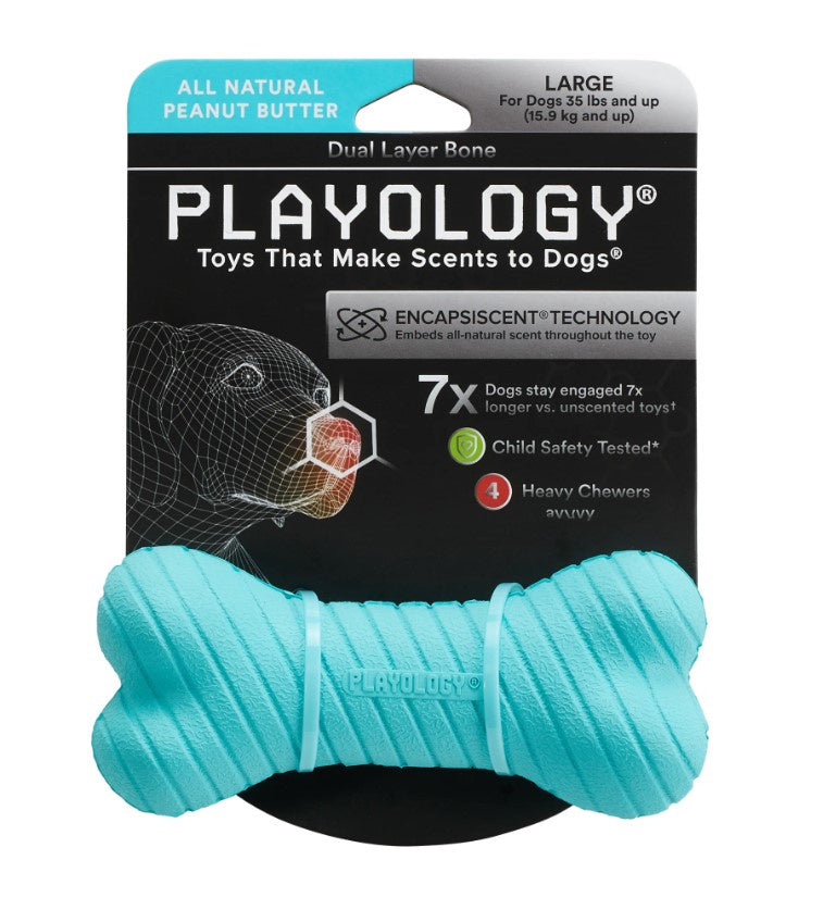 The Science of Scent Unleashed! Playology designs scented toys made from dog-safe materials that keep dogs engaged longer 7X as long as an unscented toy. Our Dual Layer Bone features an enticing scent and a unique, dual layer, ridged design that gives your dog a safe and satisfying chewing experience much like he or she would have in the wild. It is suitable for all ages and ideal for moderate and heavy chewers. Available in three sizes and a variety of mouthwatering scents allowing you to find the combination that best suits your dog's size and taste.