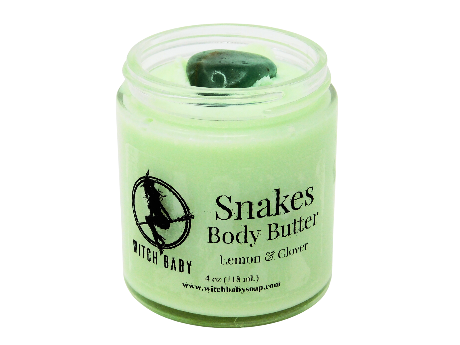 Snakes Body Butter is a sweet blend of cane sugar, dewy clover, and a bite of lemon. This thief repelling body butter is sure to make your most ardent copy cat shed their skin. An infused blend of clover, lemongrass, and vetiver combine to make a powerful snake repelling anti-theft blend. Aventurine tops this serpentine green butter bringing creativity, luck, and prosperity to its owner.