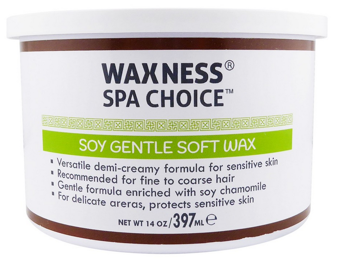 Waxness Spa Choice Soy Gentle Soft Wax is formulated for fine and coarse hair and sensitive skin. It is a very versatile wax, that can be used on all body parts. Due to its high content of oils and emollients, it protects sensitive skin while creating a strong grip on the hair. A shimmery golden color is highly visible on the skin making it easy to remove residues after waxing.